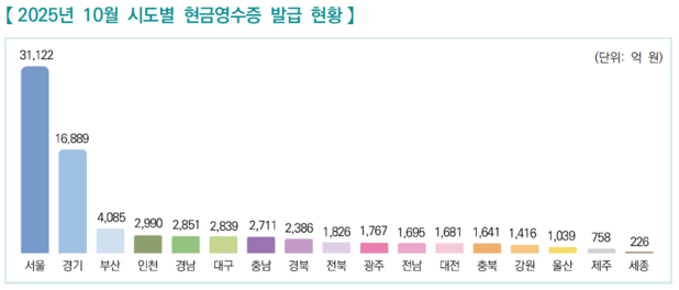 □2025년 10월 시도별 현금영수증 발급 금액을 살펴보면, 서울특별시가 3조 1,122억 원으로 현금영수증 발급 금액이 가장 많은 지역으로 나타납니다.