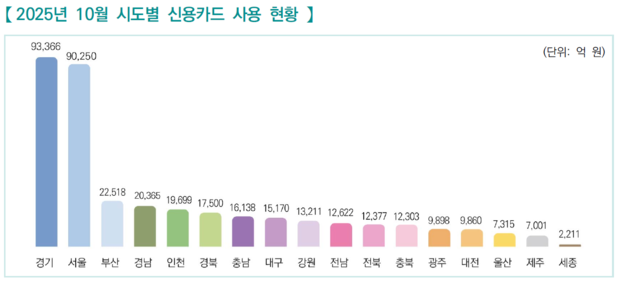 □ 2025년 10월 시도별 신용카드 사용 금액을 살펴보면, 경기도가 9조 3,366억 원으로 신용카드 사용 금액이 가장 많은 지역으로 나타납니다.