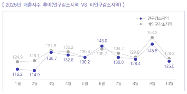 인구감소지역과 비인구감소지역의 2025년 월별 매출지수 추이를 살펴보면, 인구감소지역의 매출지수가 비인구감소지역에 비해 대체적으로 낮은 것으로 나타납니다.