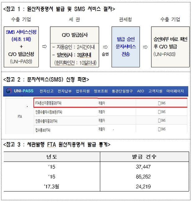 관세청에 따르면, 지금까지는 기관발급 대상 원산지증명서 발급기한이 신청일로부터 3일인 관계로 수출기업들은 세관의 원산지증명서 발급승인 여부를 계속 확인해야 하는 불편함이 있었다.