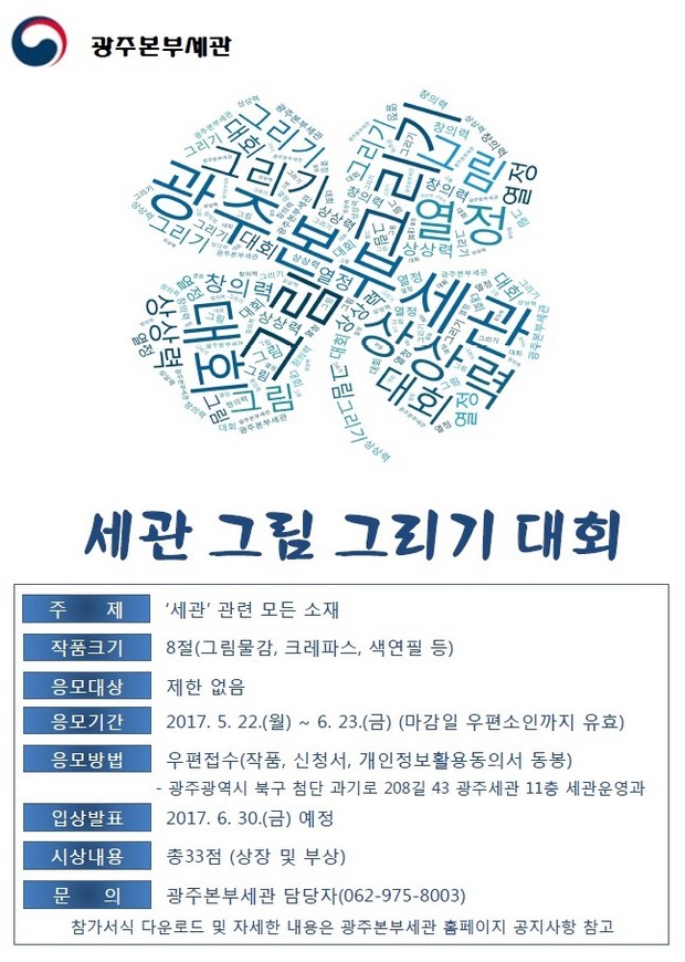 참여 방법은 대회기간인 5.22(월)부터 6.23(금)까지 광주세관 홈페이지에서 신청서 및 개인정보활용동의서를 다운받아 작품과 함께 광주세관으로 우편 제출하면 된다.
