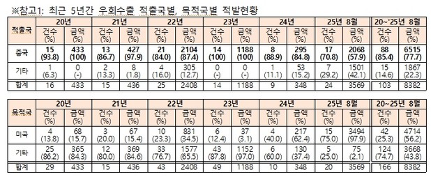 이 중에서 중국이 적출국(우회 수출 시작국)인 건수는 88건으로 전체의 85%였으며, 금액도 6515 억 원 (77%) 에 달했다.