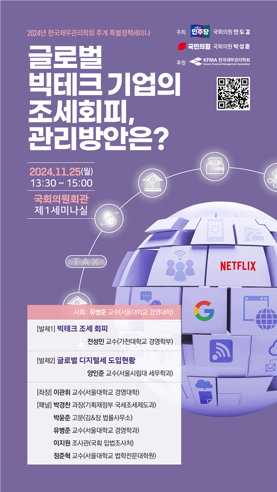 이번 토론회는 구글 등 글로벌 빅테크 기업들이 서버를 해외에 두고 국내에서 발생한 수익에 대한 조세를 회피하는 문제가 지속되는 가운데 글로벌 기업의 조세회피 실태를 진단하고 조세 정의를 바로 세우기 위한 방안을 모색하기 위해 마련되었으며, 한국재무관리학회가 후원한다.