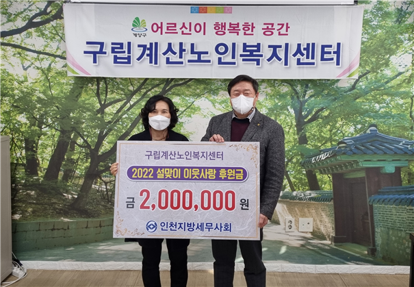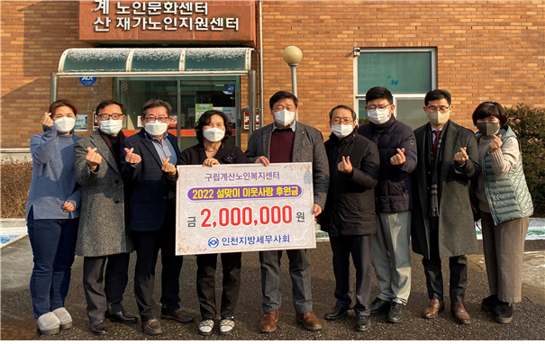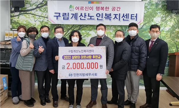 인천지방세무사회(회장 김명진)는 설 명절을 앞두고 19일(수) 인천 계양구에 소재한 구립계산노인복지센터를 방문해 소외계층과 어려운 이웃을 돕는데 써달라며 회원들이 모금한 성금 200만원을 전달했다.