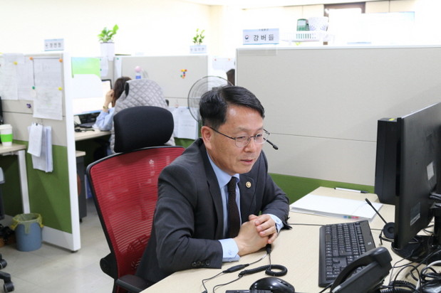| ▲ 4일 관세청 고객지원센터를 방문한 천홍욱 관세청장이 전화상담 체험을 하면서 민원인의 질의에 응대하고 있다.<사진=관세청> |