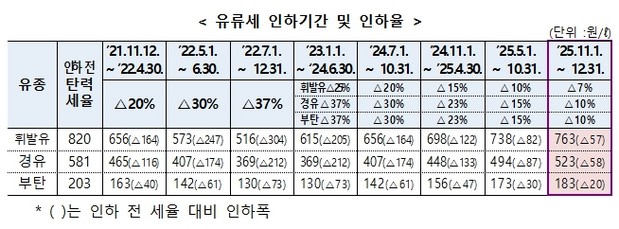 정부는 '이달말 종료 예정인 유류세 한시적 인하 조치를 12월 31일까지 2개월 연장하되, 휘발유에 대한 인하율은 기존 10%에서 7%로, 경유 및 액화석유가스(LPG)부탄에 대한 인하율은 기존 15%에서 10%로 조정키로 했다.