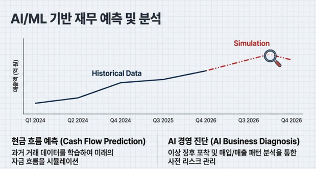 해당 기능은 과거 거래 데이터를 학습해 미래 자금 흐름을 예측하고, 매입·매출 패턴 분석을 통해 이상 징후를 사전에 감지함으로써 경영 리스크를 선제적으로 관리할 수 있도록 지원하는 것을 목표로 한다.
