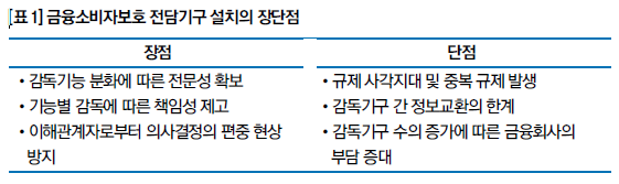 금융감독원의 건전성 감독업무와 소비자보호업무를 조직적으로 분리하여 업무의 전문성을 확보하는 것이 필요하다. 금융감독원 내에서는 조직과 권한의 축소에 대한 우려감이 커지면서 별도의 전담기구로 분리되는 것에 대한 거부감이 클 수 있다.