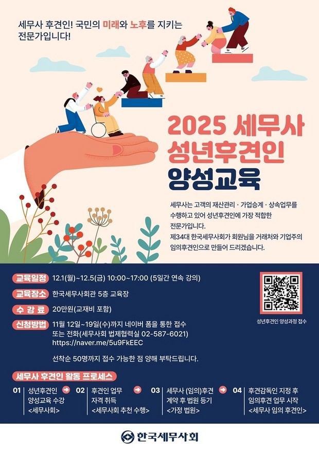 한편, 성년후견인 양성교육에 참가하기 원하는 세무사는 오는 19일(수)까지 네이버폼(naver.me/5u9FkEEC)을 통한 접수 또는 세무사회 법제협력실(02-5876021)으로 전화하면 된다.