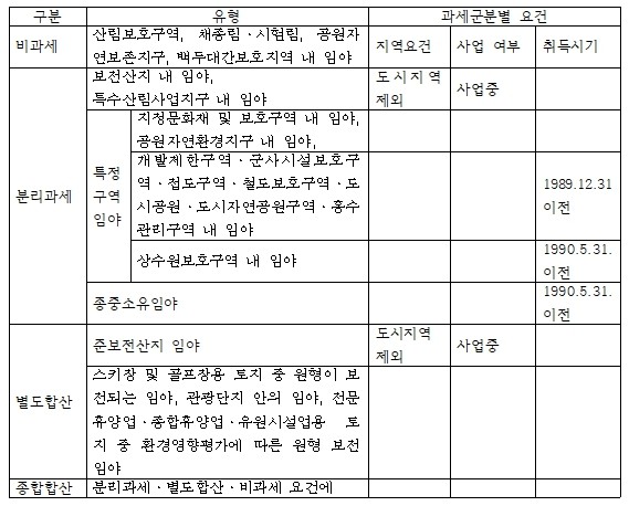 지방세법상 임야의 비과세·분리과세 별도합산 등의 유형별 요건을 아래의 표로 정리할 수 있다.