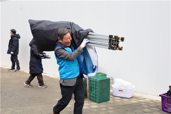 | ▲최병곤 회장이 어르신들이 식사를 할 수 있도록 천막과 테이블을 나르고 있다. |