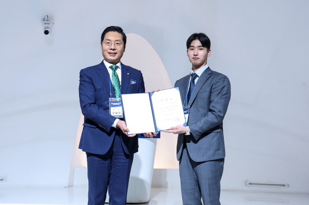 | ▲제62회 동기회장으로 선출된 빅지완 수습세무사가 구재이 세무사회장으로부터 임명장을 수여받고 기념촬영을 하고 있다. |