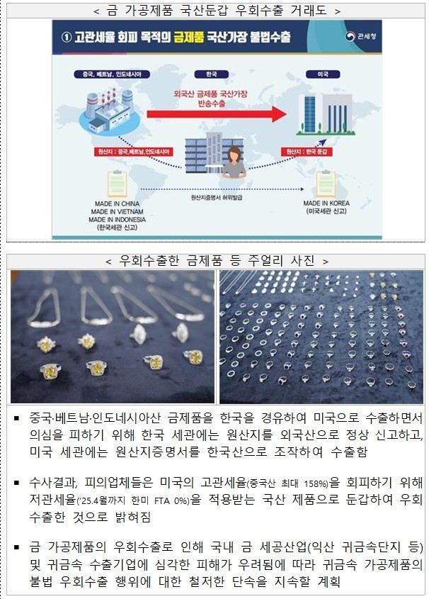 ➊ (고관세율 회피) 미국이 중국·베트남·인니산 금 가공제품에 부과하는 고관세율*을 회피하기 위해 금제품(2,839억원)의 원산지증명서를 한국산으로 허위로 조작하여 미국에 우회수출하여 국내 귀금속 가공산업 및 수출기업에 피해를 초래한 7개 업체 적발(2025.8월).