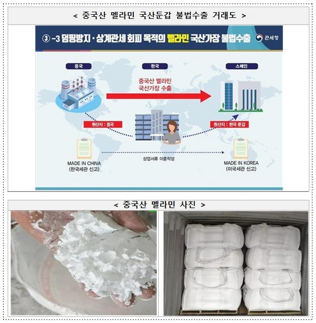 ➌-3 (덤핑방지·상계관세 회피) 중국산 멜라민*(3,580톤, 37억원)에 부과하는 EU의 덤핑방지관세**를 회피하기 위해, 스페인의 수입업자와 공모하여 중국에서 멜라민을 수입한 후 원산지증명서를 한국산으로 허위로 조작하고 국산으로 둔갑한 후 스페인으로 불법 수출한 업체 적발(2025.6월).