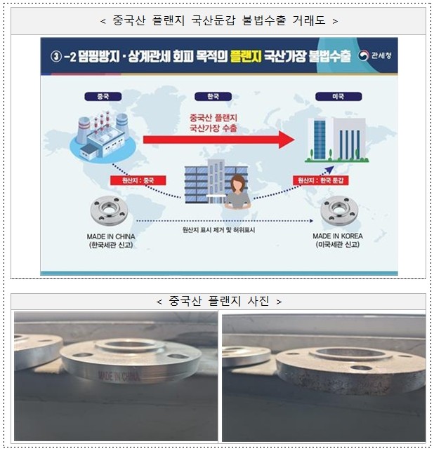 ㅇ 이들은 중국산 플랜지 현품에 표시된 ‘made in China’를 제거하고 다시 ‘made in Korea’로 각인을 한 후, 한국산으로 허위 조작한 원산지증명서를 이용해 우리나라 세관에 허위신고하고 미국으로 우회수출한 것으로 밝혀졌다.
