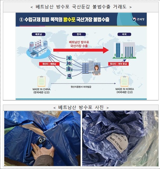 ➋ (수입규제 회피) 미국 무역협정법*에 따라 미국 정부에 납품할 수 없는 베트남산 방수포(51만개, 137억원)의 원산지증명서를 한국산으로 허위 조작하여 미국으로 우회수출한 업체 적발(2025.7월).
