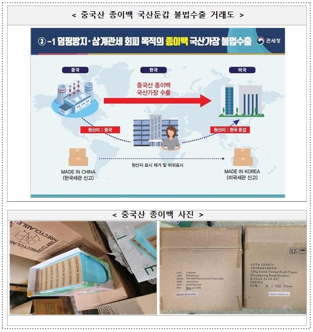 ㅇ 피의업체는 중국산 종이백의 원산지 표시를 제거하고 포장에 ‘made in Korea’ 스티커를 부착하여 한국산으로 우리나라 세관에 허위신고하고 미국으로 우회수출한 것으로 밝혀졌다.