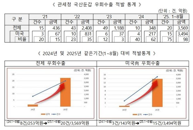 실제로 올해 1∼8월 동안 관세청이 적발한 우회수출은 3,569억원 규모로 전년도 전체실적을 크게 초과했으며, 전년 같은 기간(1∼8월)과 비교할 때 건수, 금액 각각 150%, 1,313% 증가한 수치이다.