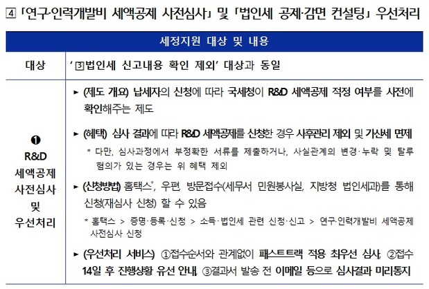 3 | | 적극적 공제·감면 지원 : 「연구·인력개발비 세액공제 사전심사」 및 「법인세 공제·감면 컨설팅」 우선처리 등 |
