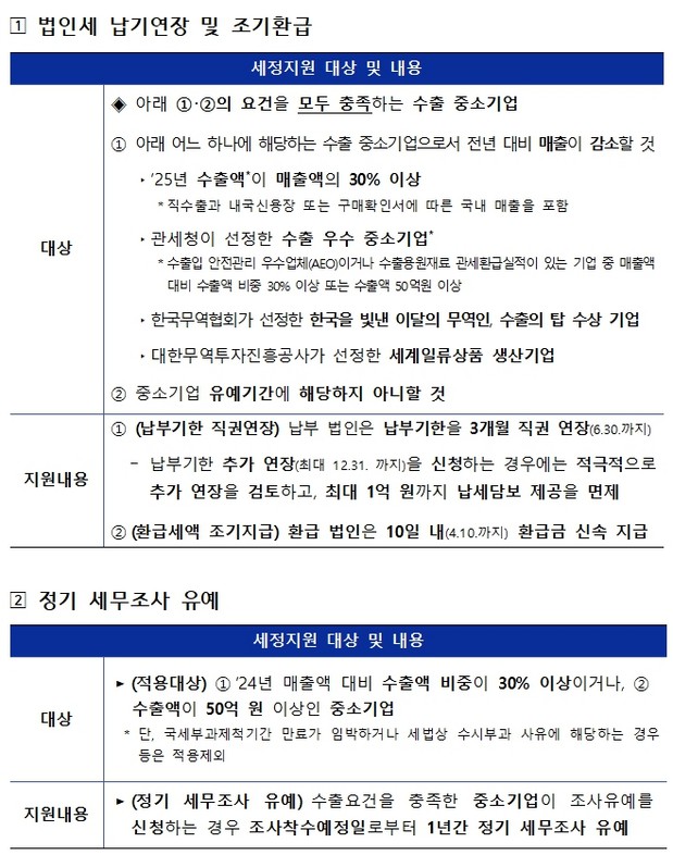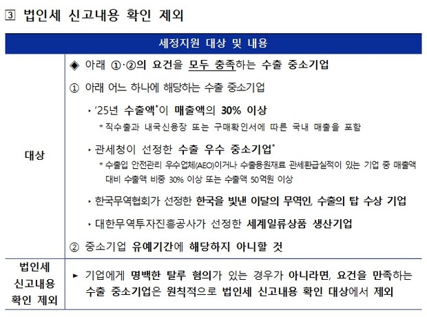 또한, 수출 중소기업*은 원칙적으로 법인세 신고내용 확인 대상에서 제외하는 등 세무검증을 최소화하여 경영에 전념할 수 있도록 도울 방침이다.