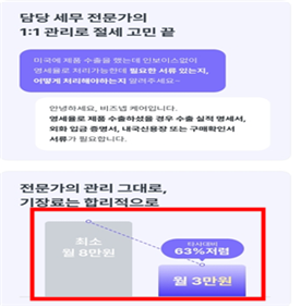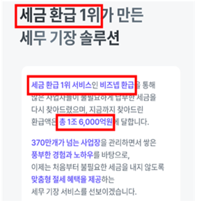 셋째, ‘세무기장료 월 3만원’, ‘세무기장료(세무사무소 10만원 vs 비즈넵 케어 3만원)’, ‘연간 조정료(세무사무소 50만원 vs 비즈넵 케어 5만원)’ 등과 같은 비교 표현을 사용하였는데, 세무 서비스 비용은 1999년 가격 규제 폐지 이후 각 세무사무소가 자율적으로 책정하는 사항임에도 비교 기준이나 객관적 근거 없이 세무사무소 비용을 일반화하여 소비자를 오인하게 할 우려가 있다. 아울러 구체적 근거를 제시하지 않은 채 ‘세금 환급 1위’, ‘누적 환급액 1조 6,000억 원’ 등을 강조하는 광고를 게시하였으나, 경쟁 서비스 역시 동일 시점 누적 환급액 1조 6천억 원 돌파를 광고하고 있어 업계 1위라는 주장에 대한 객관적 근거를 확인하기 어려운 상황이다.