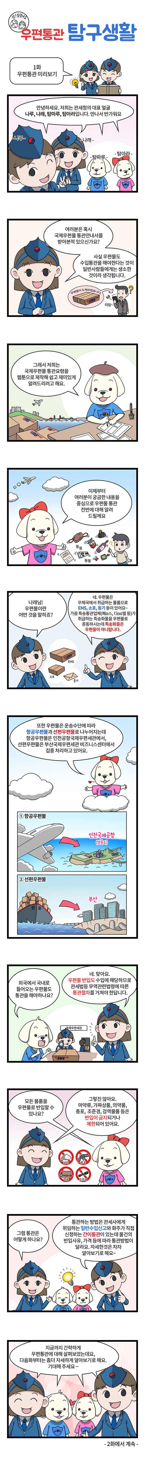 「우편통관 탐구생활」은 국제우편물 통관이 일반수입통관과는 다르고 관련정보 또한 많지 않아 통관에 어려움을 느끼는 일반국민에게 쉽고 재미있게 통관정보를 제공하기 위해 제작됐다.