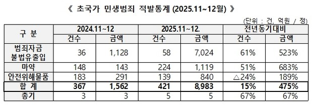 해물품 차단팀, 국제공조팀 등 전방위단속체계를 구축해 작년 11월부터 12월까지 2개월간 초국가 민생범죄 적발실적이 총 421건, 8,983억원으로 전년동기대비 건수 15%, 금액 475% 증가하는 성과를 거뒀다.