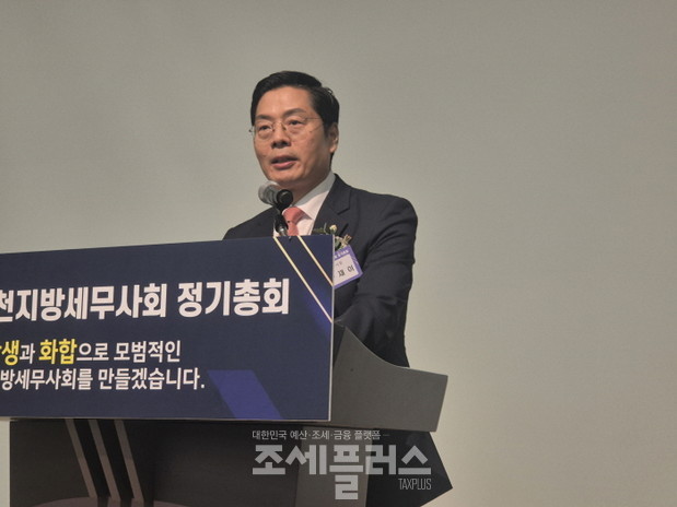 | ▲인천지방세무사회 정기총회에서 김명진 인천세무사회장이 인사말을 하고 있다. |