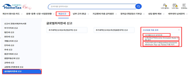 ▪[조회경로] : 홈택스 로그인 > 세금신고 > 글로벌최저한세 신고 > 신고도움자료 조회 |