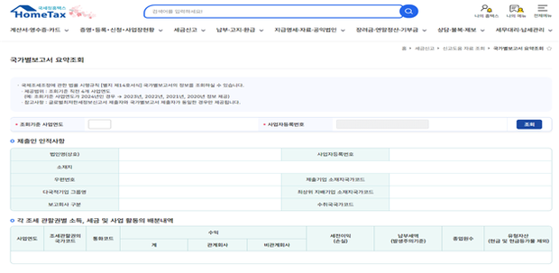 ➊(국가별보고서 요약조회) ’20년~’23년 사업연도 국가별보고서의 신고내용 중 글로벌최저한세 신고에 참고할 수 있는 항목들을 요약하여 제공