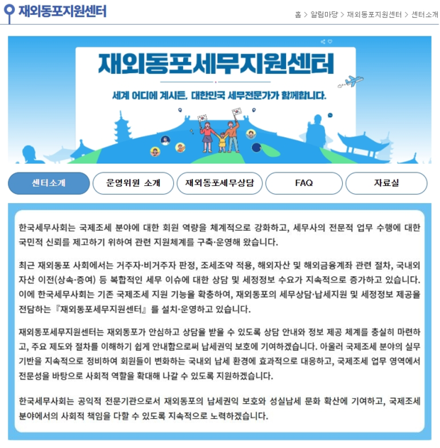 세무사회에 따르면, 센터는 홈페이지 내 센터 및 운영위원 소개, 전문상담게시판, FAQ, 자료실 등을 중심으로 구성되며, 재외동포가 필요한 정보를 보다 쉽게 찾을 수 있도록 콘텐츠를 단계적으로 확충할 예정이다.