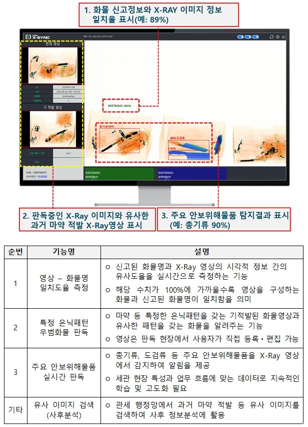 이번 사업을 통해 개발된 핵심 기능은 ▲영상-화물신고 정보 매칭▲불법·위해물품(마약·총기·도검류 등) AI 기반 판독 지원 알림 ▲X-Ray 영상 데이터베이스 분석 플랫폼 등으로, 판독 중인 화물의 X-Ray 영상에 신고정보와 실시간 측정되는 영상-품명 간 유사도를 하나의 화면에 동시 표출해 판독자의 신고 정확성 식별·판단을 지원하고, 판독 중인 화물이 사전 학습된 불법·위해물품일 가능성이 있는 경우에는 즉시 알림을 제공해 우범화물 식별·판단을 지원한다.