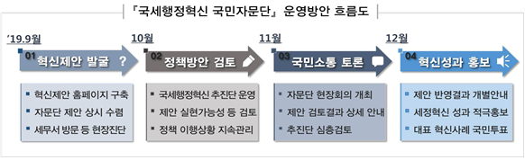 □ 운영계획 ○(목적) 국세행정혁신 추진의 전 과정에 국민의 경험과 의견을 폭넓게 수렴하여 국민이 체감하는 혁신정책 발굴 ○(기간) 위촉일 ~ ’19년 12월 (약 3개월) ○(내용) 국세행정 전반에 대한 정책제안.자문 등 의견 수렴 - (온라인) 제안 홈페이지를 신설하여 분과별 자문단 및 일반 국민의 다양한 국세행정혁신 제안을 상시 수집 - (오프라인) 분과 별 현장진단.현장회의를 통하여 현장감 있는 정책 발굴 및 제안 검토 결과 안내 등 심도 있는 토론 진행 ○(지원) 소정의 참가비, 우수 제안자에 대한 별도 인센티브 제공 ○국민자문단 운영 흐름