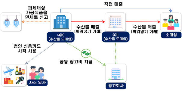 또 다른 업체는 수산물 유통업체로, 사주가 100% 지배하는 특수관계법인들을 유통과정에 줄줄이 끼워 넣어 유통 단계마다 이익을 챙기며 유통비용 상승을 유발했으며, 법인 신용카드를 골프・해외여행・자녀 학원비 등 사적으로 사용하고 법인세도 거의 부담하지 않았다.