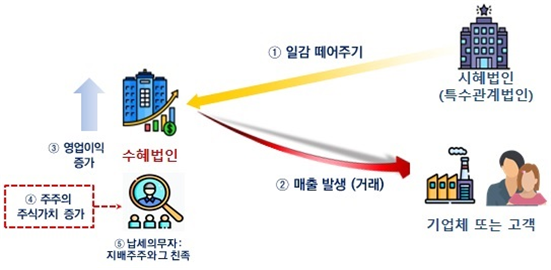 ○수혜법인(일감을 받은 법인)의 지배주주와 특수관계에 있는 법인(시혜법인)이 수혜법인에게 일감을 몰아주어 발생한 이익을 지배주주와 그 친족주주가 증여받은 것으로 보아 증여세를 과세하게 됩니다.
