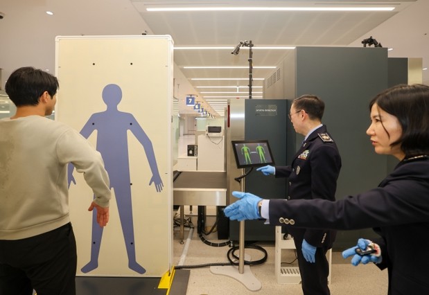 | ▲이명구 관세청장(가운데)이 22일 오전 인천국제공항 제1여객터미널에서 첨단 신변검색장비인 밀리미터파 등을 활용해 직접 여행자 신변 검사업무를 수행하고 있다. |