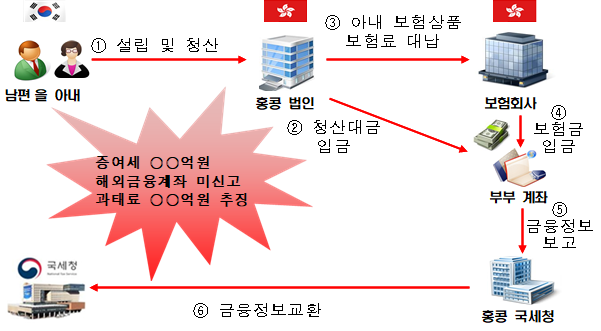 ○남편 을은 홍콩 현지법인을 청산하였으나 미화 ○○○만 불 상당의 출자금 등을 국내로 반입하지 않고 본인의 미신고계좌에 은닉한 뒤 이를 아내의 보험상품에 보험료로 납입