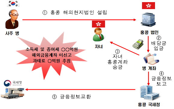 ○사주 병은 홍콩에 신고하지 않은 자회사를 설립한 후, 이를 통해 발생한 배당소득을 미신고 해외금융계좌에 은닉