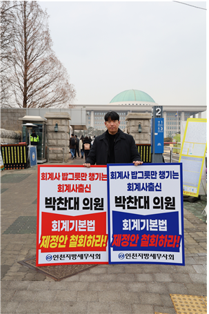 2월 10일, 인천지방세무사회 소속 세무사들이 국회 정문 앞에서 박찬대 의원(더불어민주당, 인천 연수구갑)이 발의한 ‘회계기본법’ 제정안의 즉각 철회를 요구하는 1인 시위를 전개했다.
