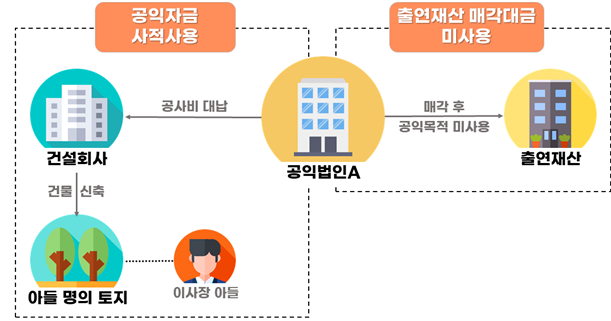 사례 1 | 이사장 자녀 명의의 건물 신축공사 비용 대납 및 출연재산 매각대금 3년 내 공익목적 미사용 |