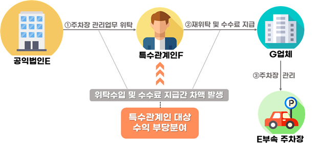 -특수관계인 F는 G업체에 주차장 관리를 재위탁하여 G업체가 특수관계인 F를 대신하여 주차장을 실제로 관리하게 함