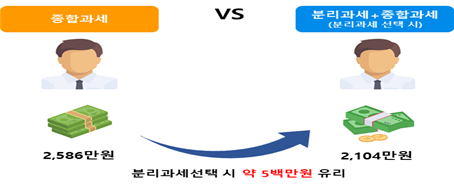 〇이듬해 종합소득세 신고 시 다른 소득과 합산하지 않고 14%~30%(지방세 별도) 수준의 낮은 세율이 적용되어 세 부담을 크게 줄일 수 있다.