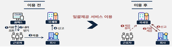 - 동일한 회사에 근무하는 경우 한번 동의하면 매년 동의할 필요는 없으며, 동의 후에도 일괄제공을 원하지 않는 경우 홈택스(또는 손택스)에서 취소가 가능하다.
