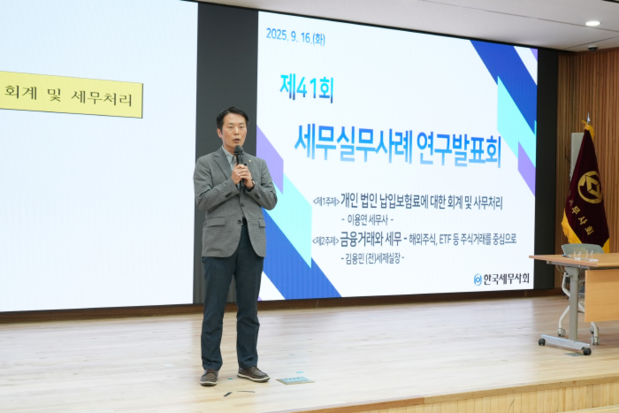 | ▲한국세무사회가 16일 개최한 ‘제41회 세무실무사례연구발표회’에서 이용연 세무사(이용연세무회계사무소 대표)가 ‘개인·법인 납입보험료에 대한 회계 및 세무처리’를 주제로 발표하고 있다. |